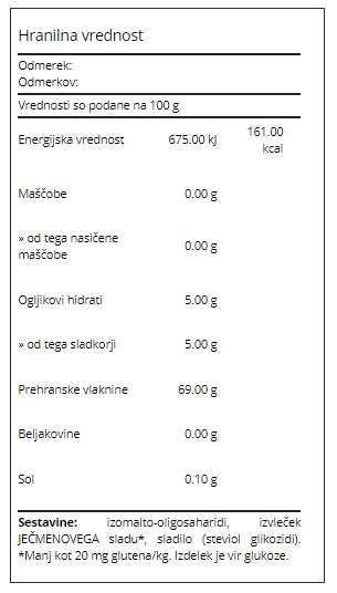 izomalto-oligosaharidi, izvleček JEČMENOVEGA sladu*, sladilo (steviol glikozidi). *Manj kot 20 mg glutena/kg. Izdelek je vir glukoze.